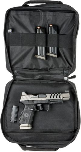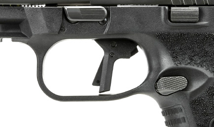 OTHER FEATURES: | LONG SLIDE, FLAT-FACE TRIGGER, 2 INTERCHANGEABLE BACKSTRAPS, LIGHTNING CUTS ON SLIDE, AMBIDEXTROUS SLIDE STOP, LOW-PROFILE OPTICS MOUNTING SYSTEM, GRAPHITE (GREY) PVD FINISH ON SLIDE, FLARED MAGWELL |